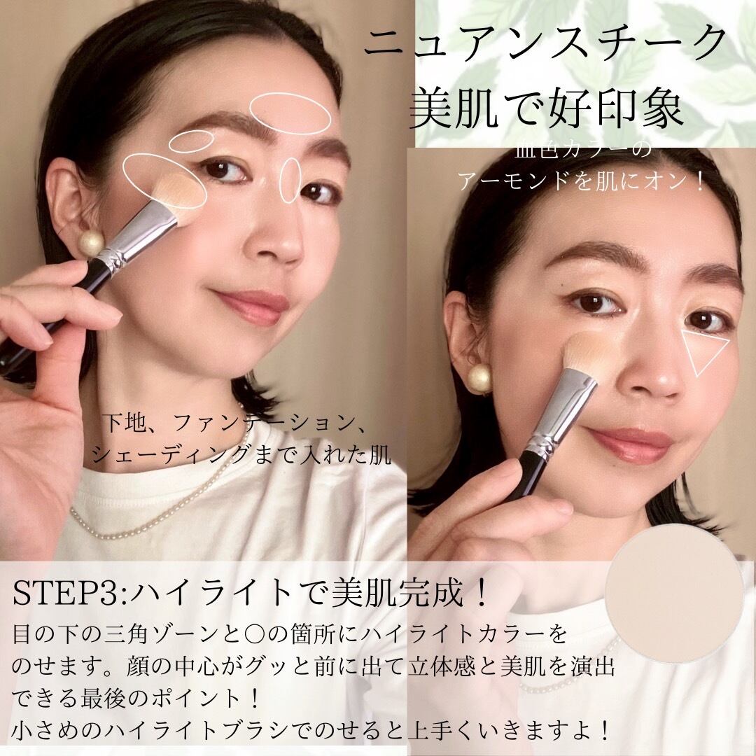 くすみ系ピンクとオレンジの組み合わせは、どんな肌色タイプの方にも似合うカラーを演出します。ナチュラルなハイライトパウダー【オークルベール】をフィニッシュハイライトとしてブレンド使用することでクスミ知らずで1日中明るく、イキイキとしたお肌を持続できます。
